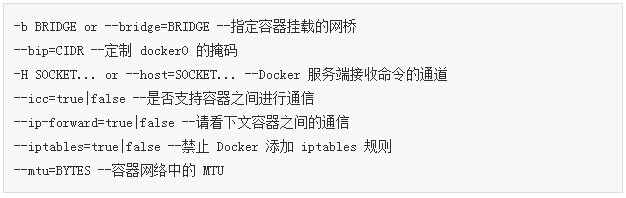 以上命令创建并运行了一个名字叫的container,并且将容器内部的端口port映射到主机的某个port,完成了端口映射,允许外网访问容器。这是容器与外界通信的方式之一。如果希望永久绑定到某个固定的 IP 地址,可以在 Docker 配置文件 /etc/default/docker 中指定 DOCKER_OPTS="--ip=IP_ADDRESS",之后重启 Docker 服务即可生效。设置网络访问的参数默认是 --icc=ture,如果--icc=false,则禁止网络访问。
