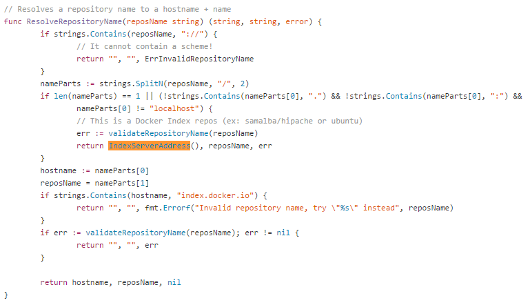 我们跟着上面的示例代码,进一步进入解析函数ResolveRepositoryName的定义代码片段(docker/registry/registry.go)