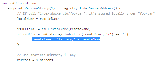 我们发现,Docker CLI会判断传入的taglessRemote参数的第一部分中是否包含’.’或者':’,如果存在则认为第一部分是Registry地址,否则会使用Docker官方默认的Registry(即index.docker.io其实这里是一个Index Server,和Registry的区别留在后面再去深究吧),即上面代码中高亮的部分。背后的故事还没有结束,如果你向DockerHub上传过镜像,应该记得你上传的镜像名称格式为user-name/repository:tag,这样用户Bob和用户Alice可以有相同名称的Repository,通过用户名前缀作为命名空间隔离,比如Bob/ubuntu和Alice/ubuntu。官方镜像是通过用户名library来区分的,具体代码片段如下(docker/api/client/command.go中的CmdPull函数)