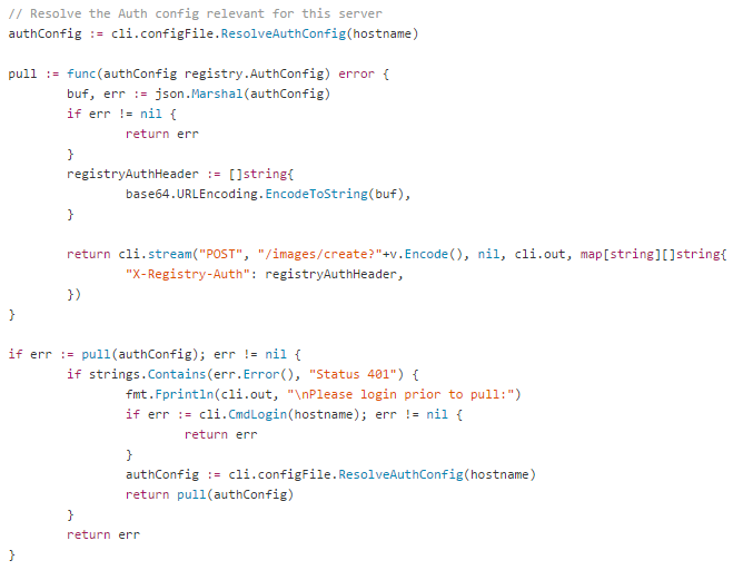 上面我试图去拉取一个ubuntu镜像,并且指定了Registry为我本机搭建的私有Registry。下面是Docker CLI中pull命令的代码片段 (docker/api/client/command.go中的CmdPull函数)