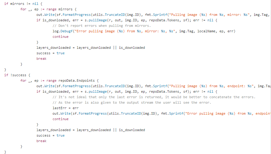 从代码中可以发现,如果配置了Registry Mirror,Docker Server会首先从Mirror中拉取镜像,如果Mirror拉取失败会退而求其次从镜像中指定的Registry拉取。大家又可以松口气了,就算配置的Registry Mirror失效,也不会影响用户拉取镜像,只不过速度就。。。