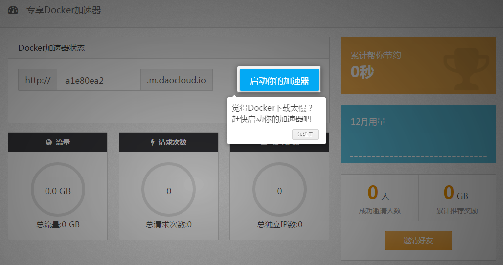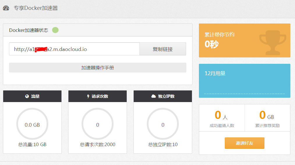 启动成功后,你就拥有了一个你专用的Registry Mirror地址了,加速器链接就是你要设置”--registry-mirror“的地址。目前每个用户有10G的加速流量(Tips:如果流量不够用可以邀请好友获得奖励流量,邀请越多奖励越多哦)