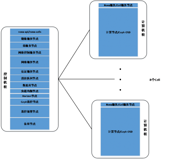 2. 8个Cell的计算节点,每个Cell包含128个节点,包含2个Cell Server节点(运行除nova-api之外的nova-*服务、nova-cells、消息队列和数据库)和126个计算节点,每个计算节点同时运行ceph的osd服务。