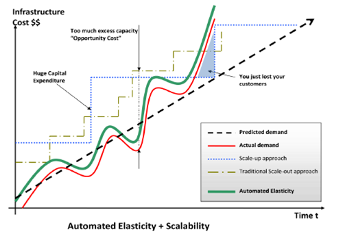 传统向外扩展的途径: 创建水平扩展的架构和投资小块的基础设施。大多数业务或大规模web应用都采用如下的模式,分布式应用组件,联合数据集和SOA的设计。 这种方法通常比放大扩展更有效。然而,这需要准确的业务预期才能实现满足需求的部署。经常会导致容量过剩(“烧钱”) 和持续人工监测 (“浪费人力成本”).此外,如果遇到业务的爆发式增长,系统将无法正常工作。
