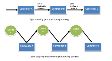 建立松耦合系统的另一方式是使用消息队列。如果两个组件间通过队列或者缓冲区连接的话,可以支持高并发,高可用和负载削峰。其结果是,即使元件部分功能暂时不可用,整个系统仍然继续执行。如果一个组件死亡或暂时不可用时,系统将消息缓存起来,在组件恢复时再处理他们。