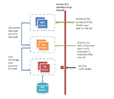 安全组是网络流量入口规则的集合,需要指定TCP 和 UDP 端口, ICMP 类型和代码,以及源地址等,每个Amazon EC2实例都被一个或多个安全组所保护。安全组为运行实例提供基本的类似防火墙保护。例如,隶属应用的实例有如下的安全组设置: