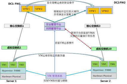 一是能够根据资源和业务的变化,自动实现安全策略配置的动态调整。例如,当云计算环境内的虚拟机迁移时,安全管理平台能够感应到虚拟机迁移状况,从虚拟机管理系统中获取虚拟机迁移前后的各种信息,包括虚拟机迁移前所在物理主机以及迁移后物理主机位置及IP地址信息,然后通过网络管理系统中的网络拓扑图(拓扑图中包括了所有网络资源的连接关系),定位出迁移后物理主机所在交换机端口进而找到所属防火墙设备,然后系统自动匹配并找出虚拟机原有安全策略,并将原有策略重新部署到新的防火墙中,实现安全策略的自动迁移,实现云计算环境中多种安全设备的安全策略的一致性与快速部署,保障网络安全。迁移过程如图2所示。