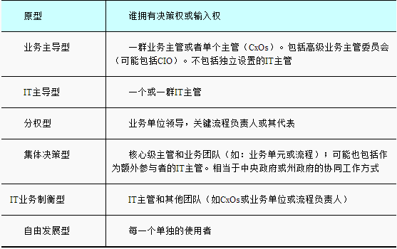 决策权归属和责任担当,根据不同的利益相关者主体,采用一些政治上的原型(君主制、封建制、联邦制、双寡头、无政府制)来描述拥有IT决策权归属和责任担当或者为IT决策提供信息输入的决策主体组合,如下表所示。