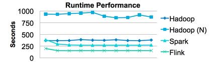 从这个架构图我们可以发现我们其实基本上用了整个Hadoop生态系统的很多技术和系统。大家一定会问我们为什么会把Flink和Spark一起用。在昨天发的Hadoop Summit 2015有一些简单介绍了。这里,先给大家透漏一下我们做的一个比较:是测试的K-Means,这个数据还是有一些吃惊的。