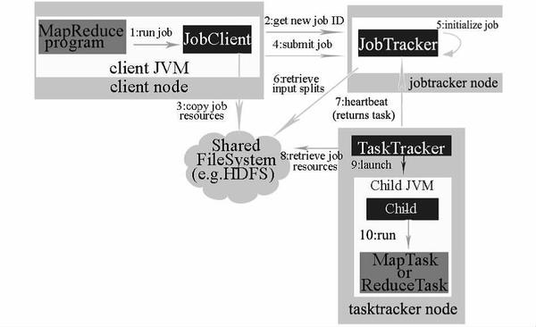 在最上层有 4 个独立的实体,即客户端、JobTracker、TaskTracker 和分布式文件系统。客户端提交 MapReduce 作业;JobTracker 协调作业的运行;JobTracker 是一个 Java 应用程序,它的主类是 JobTracker;TaskTracker 运行作业划分后的任务,TaskTracker 也是一个 Java 应用程序,它的主类是 TaskTracker。Hadoop 运行 MapReduce 作业的步骤主要包括提交作业、初始化作业、分配任务、执行任务、更新进度和状态、完成作业等 6 个步骤。
