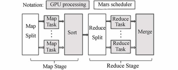 Mars 框架中,Map 和 Reduce 的处理阶段都在 GPU 内进行,Map 和 Reduce 的分割数据阶段都在 CPU 内进行,这是与其他基于 CPU 的 MapReduce 框架的最大不同。Mars 更多的是利用 CPU、GPU 缓存来替代内存,执行数据分割、处理过程。