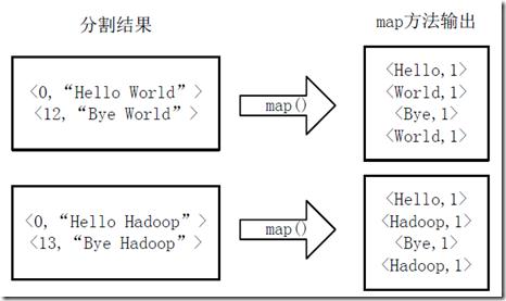首先需要将文件拆分成 splits,由于测试用的文件较小,所以每个文件为一个 split,并将文件按行分割形成<key,value>对,图 12 分割过程图所示。这一步由 MapReduce 框架自动完成,其中偏移量(即 key 值)包括了回车所占的字符数(Windows 和 Linux 环境会不同)。