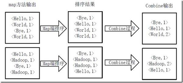 得到 map 方法输出的<key,value>对后,Mapper 会将它们按照 key 值进行排序,并执行 Combine 过程,将 key 相同的 value 值累加,得到 Mapper 的最终输出结果。图 7Map 端排序及 Combine 过程所示。
