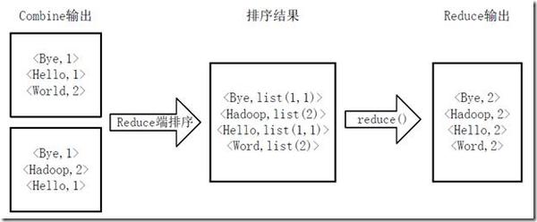 Reducer 先对从 Mapper 接收的数据进行排序,再交由用户自定义的 reduce 方法进行处理,得到新的<key,value>对,并作为 WordCount 的输出结果,图 15Reduce 端排序及输出结果所示。