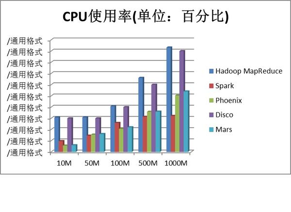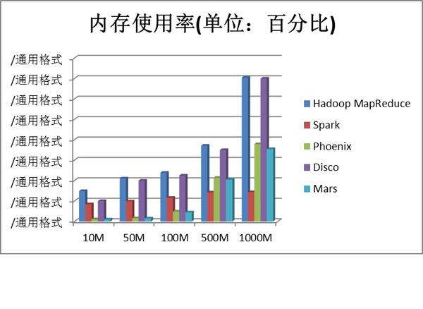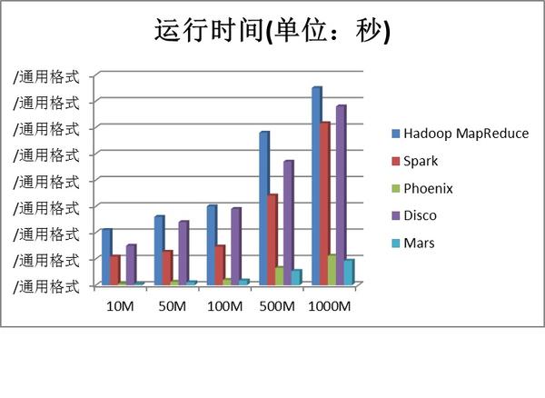 本次实验的硬件资源基于 x86 服务器 1 台,配置为内存 32GB DDR3、E5 CPU/12 核、GPU,实验数据样本为 10M/50M/100M/500M/1000M 的文本文件五个,我们使用 Hadoop MapReduce、Spark、Phoenix、Disco、Mars 等 MapReduce 框架分别运行文本分析程序,基于结果一致的前提下统计出运行时间、运行时 CPU 占有率、运行时内存占有率等数据,并采用这些数据绘制成柱状图。