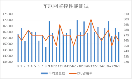 接下来我们对这个系统进行了一个简单的吞吐量测试。我们只有1个Topic,使用5个partition、3个worker、1个Spout和2个Bolt,在一台2核2GB的ECS上运行。我们使用了另外4台客户端,每个客户端有4核8G内存,分别启动40个线程不断向这个系统实时发送汽车信息,模拟160台汽车发送的情况,其消息发送数量和CPU占用率情况如图8所示。