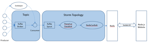 接下来做的就是将车辆信息实时监控系统部署到系统中。这个系统演示了如何编写一个Storm的Topology,从Kafka消息系统中将信息读取出来。我们使用Kafka的客户端模拟从世界各地发送车辆实时信息给Kafka集群,然后Storm