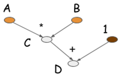 符号式程序的不同之处在于,当执行 C = B * A 这一行代码时,程序并没有产生真正的计算,而是生成了一张计算图/符号图(computation graph/symbolic graph)来描述整个计算过程。下图就是计算得到D的计算图。