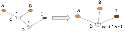 符号式程序的另一个优化点是运算折叠。上述代码中,乘法和加法运算可以被折叠为一次运算。如下图所示。这意味着如果使用GPU计算,只需用到一个GPU内核(而不是两个)。这也正是我们在cxxnet和Caffe这些优化库中手工调整运算的过程。这样做能提升计算效率。