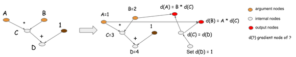 D的grad函数生成一幅反向计算图,并且返回梯度节点gA和gB。它们对应于下图的红点。