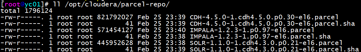 将前面下载的CDH 和 IMPALA 放到 /opt/cloudera/parcel-repo 下,再生成