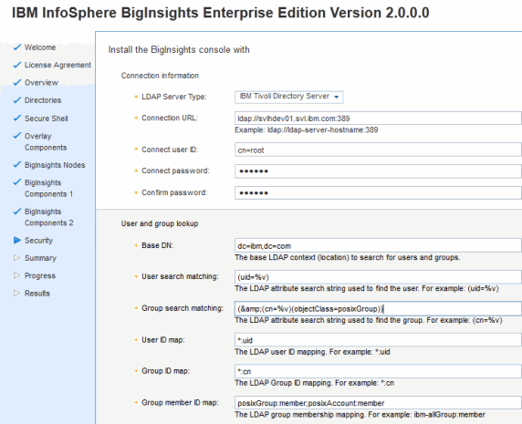 设置 SSH 配置需要的必要信息,包括 root 用户密码,BigInsights 的管理员账户及密码和