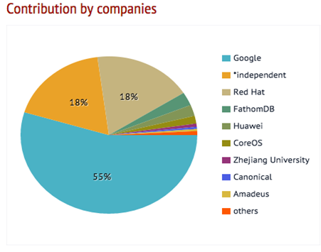 3)Kubernetes的另外一位大玩家就是Redhat。至于是Google主动邀请Redhat加入,还是Redhat主动要求加入这一点我无从得知。但是,最终Redhat是全情投入了。下图就是Kubernetes过去一年多Contribution的公司分布,其中Google和Redhat是绝对的主力。