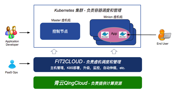 从目标用户视角看,Kubernetes集群(容器云)的使用者是应用开发人员,或者准确的讲是基于Docker容器的微服务开发者,而FIT2CLOUD和QingCloud的使用者是Kubernetes集群(容器云)运维和系统管理员。下图描述了Kubernetes、QingCloud、FIT2CLOUD三者及其使用者之间的关系:
