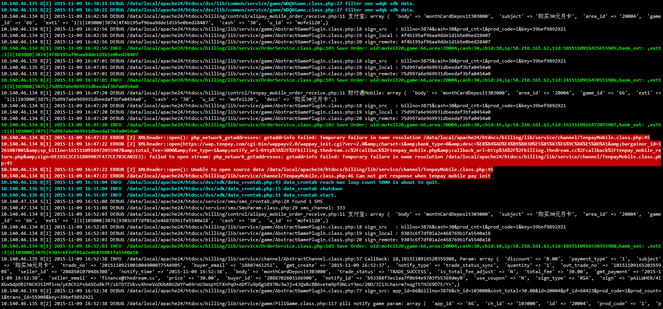 单个屏幕上所有服务器的日志实时滚动着显示。每条日志开头还标明日志的来源(下图)。
