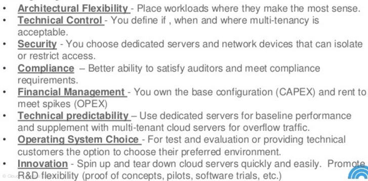 - 灾备(DR):在私有云出现故障时,由公有云上的灾备环境提供服务