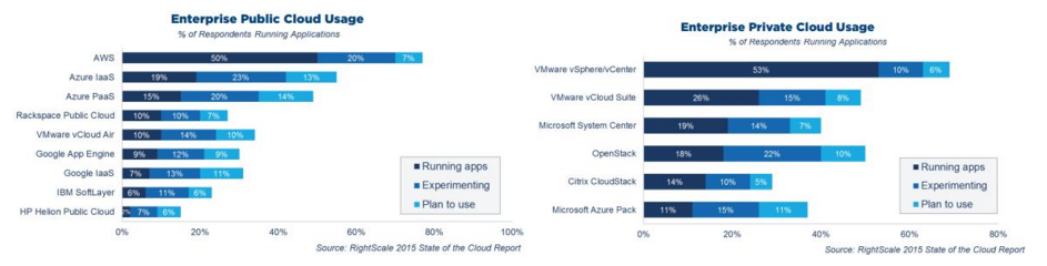 要看主流的混合云方案,先要看在私有云和公有云领域的几大玩家分别是谁: