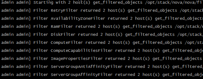 日志显示初始有两个 host(在我们的实验环境中就是 devstack-controller 和 devstack-compute1),依次经过