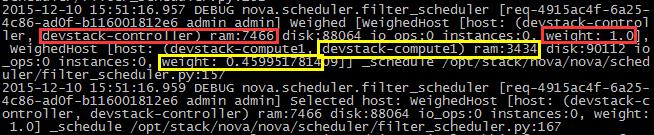 多(7466 > 3434),权重值更大(1.0 > 0.4599),最终选择 devstack-controller。
