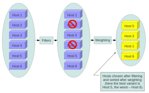 通过权重计算(weighting)选择在最优(权重值最大)的计算节点上创建 Instance。