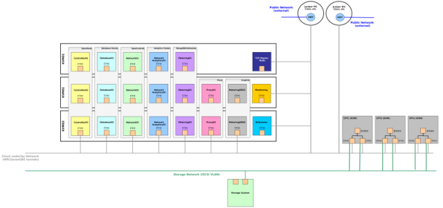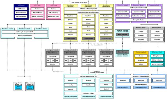 不过,即使用上了 OpenStack-Salt ,基础设施仍然如下图所示那么复杂。单看云控制平面部分,就包含了运行在至少 3 台物理机(安装了 KVM 虚拟机管理器)上的 23 个虚拟机。为了提供灵活性和面向服务的架构,我们必须升级、打补丁和维护 23 个操作系统。