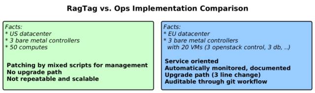 接着你会发现现有的部署工具无法涵盖整个生产环境(多个网卡绑定聚合、存储设置、服务分离等)。这时候云团队会问自己:我们真的需要花一天功夫设置好环境,再花 5 分钟部署到一台机器上吗?我们真的需要一个能点击的图形界面来部署吗?这些是能决定将来生产环境正确选择的关键点吗?启动一个 OpenStack 系统相对容易而部署工具只会被运行一次?你无法两次运行部署工具? 如何解决 OpenStack 系统生命周期的各种问题,如打补丁、升级和配置修改等?思考这些问题,我们会再次得出结论:任何人,只要他不具备“次日运维”经验,就没法选择正确的解决方案。 译者注:次日运维(Day 2 Operations)实际上就是指运维。第一天引导、配置和运行基础设施及应用,第二天管理和维护正在运行的基础设施及应用。