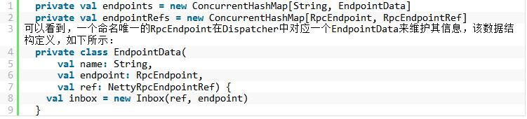 一个RpcEndpoint只能注册一次(根据RpcEndpoint的名称来检查唯一性),这样在Dispatcher内部注册并维护RpcEndpoint与RpcEndpointRef的绑定关系,通过如下两个内部结构: