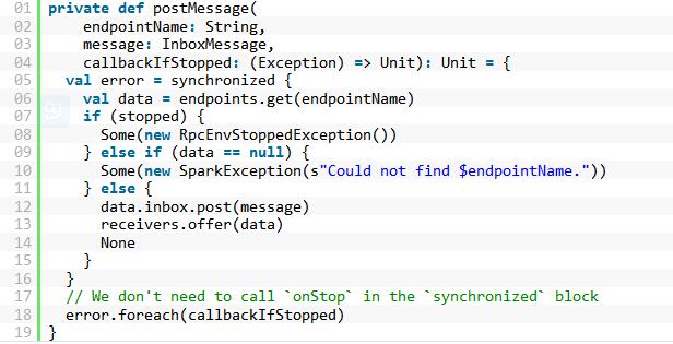 这里,又继续调用Inbox的process方法来派发消息到指定的RpcEndpoint。通过上面的序列图,我们可以通过源码分析看到,原始消息被层层封装为一个RpcMessage ,该消息在Inbox的process方法中处理派发逻辑,如下所示: