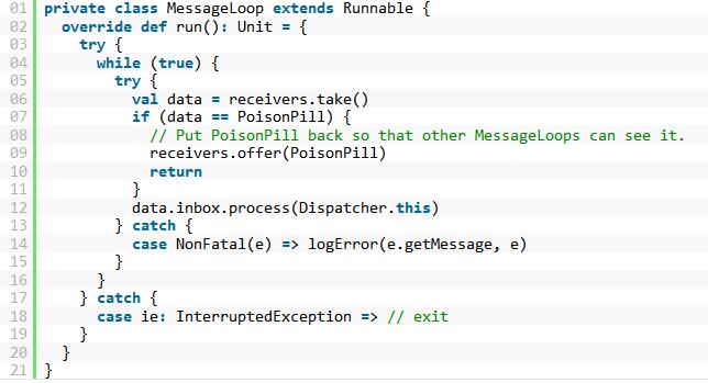 上面通过data.inbox派发消息,然后将消息data :EndpointData放入到receivers队列,触发Dispatcher内部的MessageLoop线程去消费,如下所示: