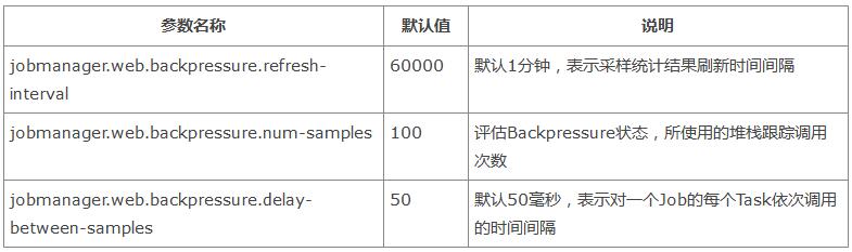 jobmanager.web.backpressure.delay-between-samples 50 默认50毫秒,表示对一个Job的每个Task依次调用的时间间隔