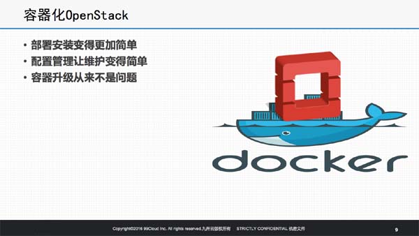 可以说,在容器出现之前,这个问题是无解的。容器出现后,看到了希望,把Openstack放在容器里面进行升级。接触过容器的应该知道,在容器里面没有安装的过程,它已经提前把安装文件录入到file里面。只需将Docker放到相应的机器上面,启动起来,再把配置文件放回去,就可以把Openstack装起来。这样,整个过程能减少很多问题。至少,之前很容易遇到的语言冲突、包冲突的问题可以解决掉。