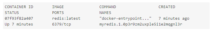 ID NAME IMAGE NODE DESIRED STATE CURRENT STATE ERROR PORTS 0p3r9zm2uxpl myredis.1 redis manager Running Running 48 seconds ago ty3undmoielo myredis.2 redis worker1 Running Running 44 seconds ago |