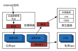 为了避免用户恶意代码对网络的探测和入侵,如下图所示,用户函数实例被限制到了受限的公共VPC网络,需通过网关实现与外网服务、其它函数实例、云组件的互访,同时,为了支持用户函数实例与个人CVM虚拟机的集成,云函数平台通过弹性网卡打通了与其私有VPC的网络通信。