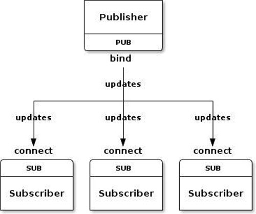 客户端与服务器采用WebSocket协议,实时传输相关数据。相关数据方面采用的是ZMQ。云帮主要使用了ZeroMQ消息队列中的Publisher-Subscriber模型,将所有相关信息汇总到一个节点上在推送到其他节点上。即客户端(SUB)向服务器(PUB)订阅消息,然后服务器将消息推送到所有订阅了消息到客户端,类似于广播。之所以采用ZMQ,而不是Socket的原因,前者支持N:M的连接,后者只能1:1的连接。其消息队列模型示意图: