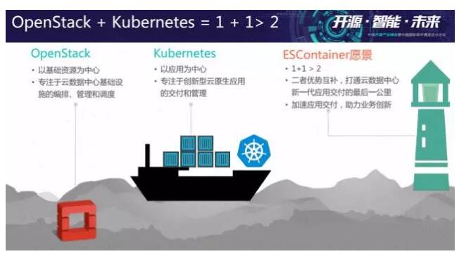 我们把它们两者结合起来,就是说使两者之间1+1大于2,把两者之间优势互补,就是底层的基础设施管理交给OpenStack来做,上层的云原生应用的交付和管理来做,两者相互互补,加速应用交付,助力业务创新。这是OpenStack和Kubernetes融合的一个最大的理念,就是它们两者之间所擅长的时间并不一样,但是关注点各有不同。