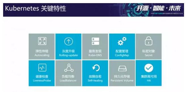 这是是Kubernetes的关键特性,这边列了几个点第一个Autoscaling是说我们可以设置一个预值,可以弹性的把这个应用进行伸缩。第二个灰度升级,就是我们应用如果上线比较频繁的话,我们可以采用滚动更新的方式让应用同时在不断线的情况下完全升级。服务发现是说我们如果把一个大的系统拆成一个小的移动的话,服务之间肯定要有一套完整的发言机制,因为容器的网络,容器的IP变化非常频繁,因为不停地会创建项目,这样就有一个比较完整的服务发现的机制,我们也是把Kube-DNS这一套插件引入到整个容器平台,为各种应用来提供服务方向的机制。