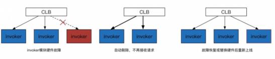 比如平台内部Invoker模块实例硬件故障时,如下图所示,由于invoker模块无状态,故障时可由接入层CLB模块自动剔除,剔除后新请求分发至剩余invoker模块实例,已接收的异步事件可由其它invoker重试完成,同步http调用会直接返回给用户错误请求,由用户重试,在故障invoker实例恢复后,自动添加至CLB中,继续分担负载。
