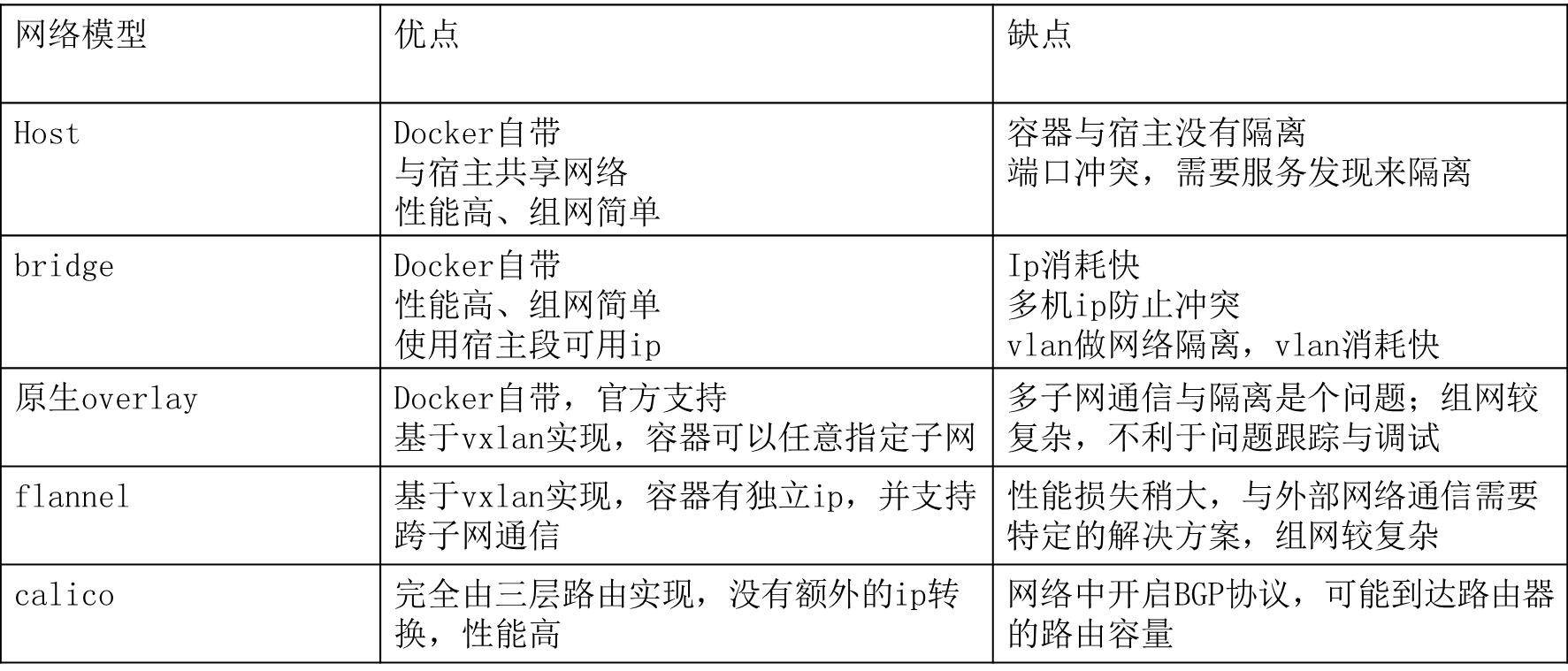 网络模型是任何云环境都必须面对的问题,因为网络规模一旦扩大之后,会带来各种问题。网络选型这块,针对Docker和Kubernetes的特性,对六种组网方式进行了对比,如下所示: