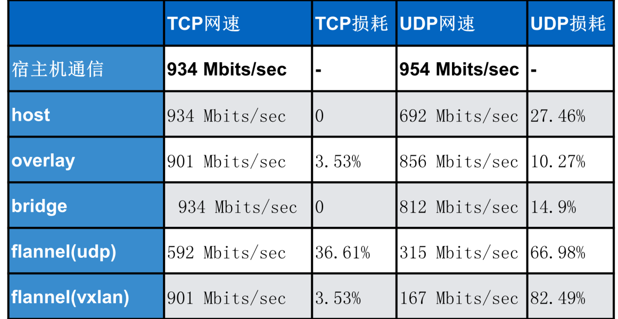 通过测试结果可以看出:Host模式和Bridge模式性能与宿主机是最接近的,其他组网模式还是有一些差距的,这和Overlay的原理有关。