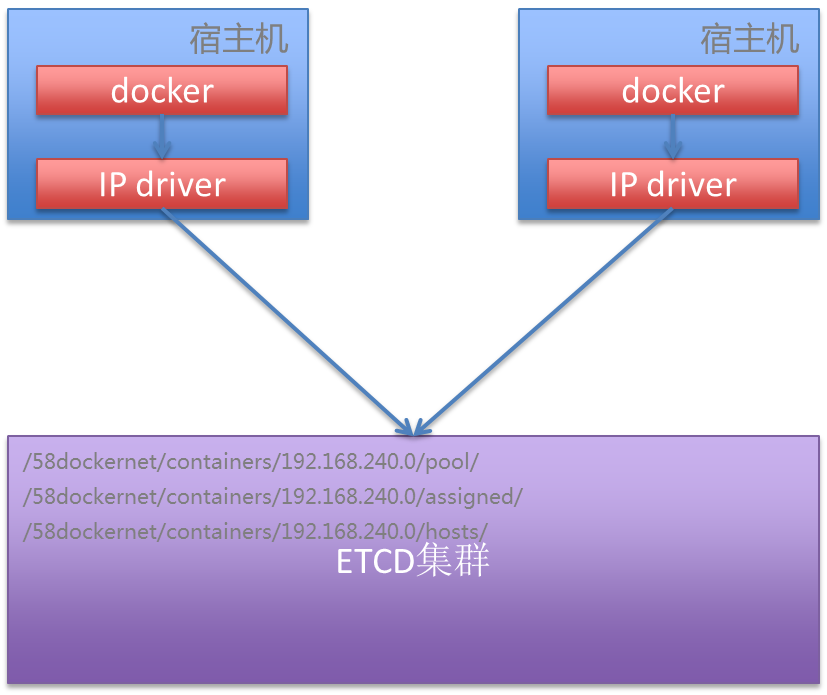 这里还有一个问题,默认的使用Bridge模式是每个宿主机配置不同网段的地址,这样就可以保证不同宿主机上为容器分配的IP不冲突,但是这样也会导致会出现大量的IP浪费;机房的内网环境IP资源有限,没有办法这样配置网络,所以只能开发IPAM模块进行全局的IP管理。IPAM模块的实现参考了开源项目Shrike的实现,将可分配的网段写入etcd中,Docker实例启动时,会通过IPAM模块从etcd中获取一个可用IP,在实例关闭时,会对IP进行归还,整体架构如下所示: